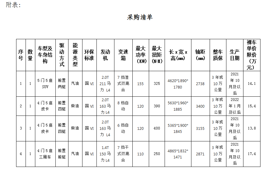 1.根據(jù)業(yè)務(wù)發(fā)展需要,滁州市興元商貿(mào)有限公司擬集中采購業(yè)務(wù)保障車輛共計4輛,詳情見附表。